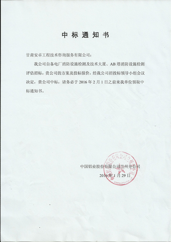 【中標公告】中國鋁業股份有限公司蘭州分公司消防設施檢測AB塔消防設施檢測評估中標通知書