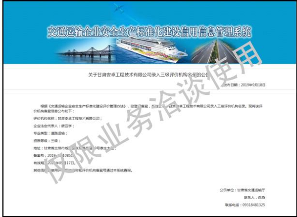 交通運輸企業安全生產標準化三級資質