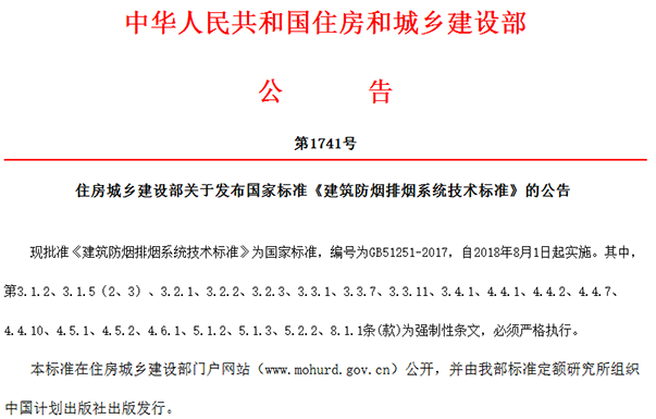 【安全公告】《建筑防煙排煙系統技術標準》GB51251-2017發布,2018年8月1日實施